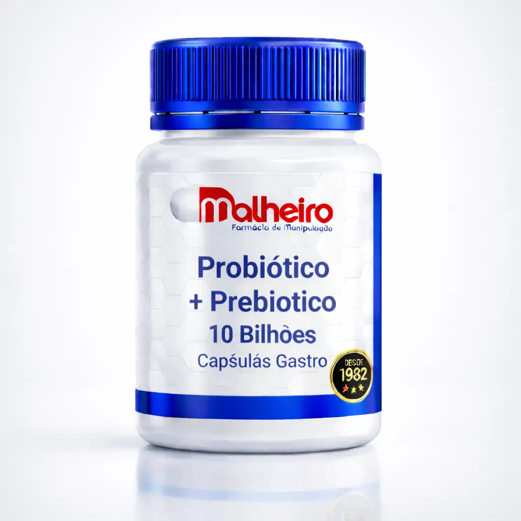 O Simbiótico 10 bilhões da Farmácia Malheiro combina cepas probióticas selecionadas com prebiótico FOS em cápsulas gastro resistentes, desenvolvidas para proteger os microrganismos do ambiente ácido do estômago e favorecer sua liberação no intestino.